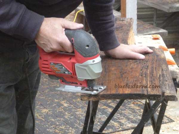 Cutting the shape with a scroll saw or jigsawThe basic shape is drawn onto the precious antique barnboards with a pencil, then cut out with a jigsaw. I do the drawing, my assistant does the cutting, with close supervision to avoid any misunderstanding.