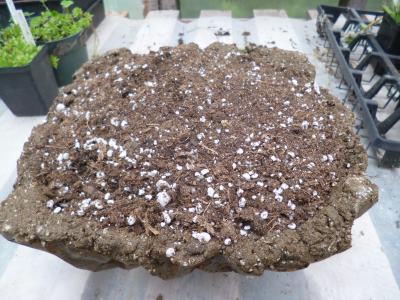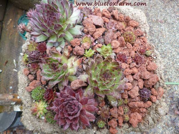 Now I can plant it; the Sempervivum chicks are dredged in diatomaceous earth to stop any bugs dead in their tracks.