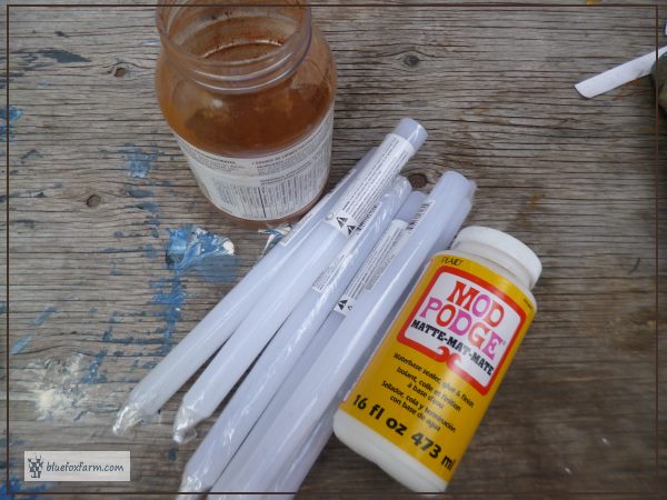 Dip your brush into the Mod Podge or other white glue, and spread it onto the candle, avoiding the top and bottom - the top part will be where it's lit, so it won't need the grubbiness on it, and the bottom will be inserted into the candle holder.
