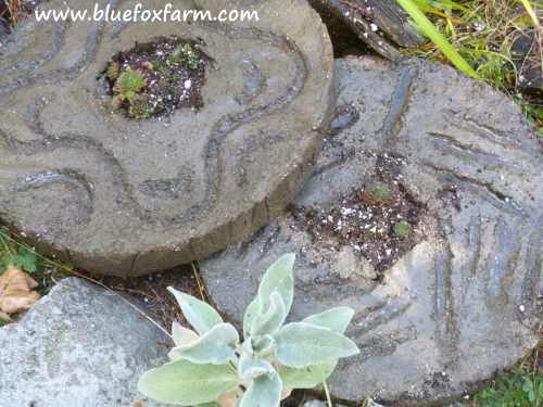 The center holes are perfect for planting with some little stonecrop and hens and chicks. Three millstones are now in place by the pond, looking as though they've always been there.