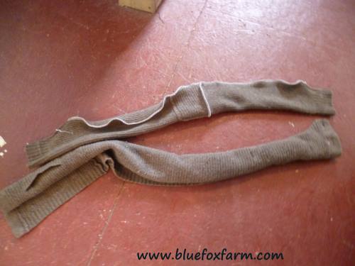 The bottom part of the sweater (in this case a cardigan style) is cut off to stuff the doormouse. It is rolled into a loose tube and pulled through the outer layer.