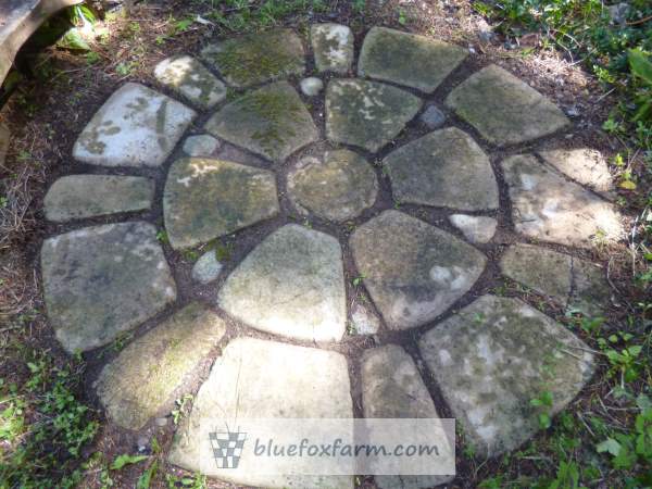 The patio blocks end up being around 35-40cm (just over 1') long, with varying widths so they fit together in the finished medallion. The round circle block in the center is made from a plastic bag inside a bucket so you can pull it out once it’s set.