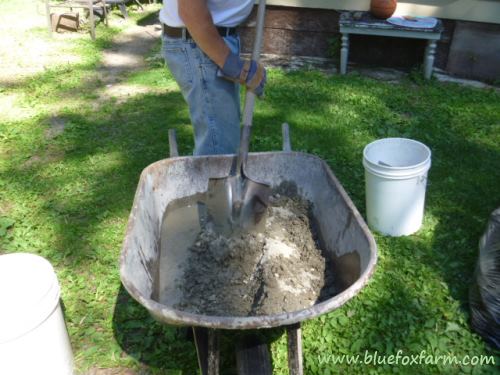 Mixing the cement is easiest in a wheelbarrow with a shovel, but if you like you can mix all the dry ingredients with surgical gloves (always wear gloves as the cement powder is caustic) and if it’s dusty, wear a mask.