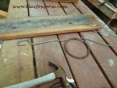 Gather your supplies; a couple of wire sock stretchers, two little metal castors off an old bed frame, wire fence staples, some little spoons, wire and a piece of weathered wood start off this project.